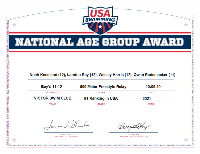 On behalf of Victor Swim Club Coaching Staff & Board of Directors, congratulations on our swimmers' remarkable achievement of a USA Swimming National Age Group #1 Ranking. This is the first National Age Group #1 Ranking for Victor Swim Club, breaking a 34-year old Niagara LSC record, and VSC team record.